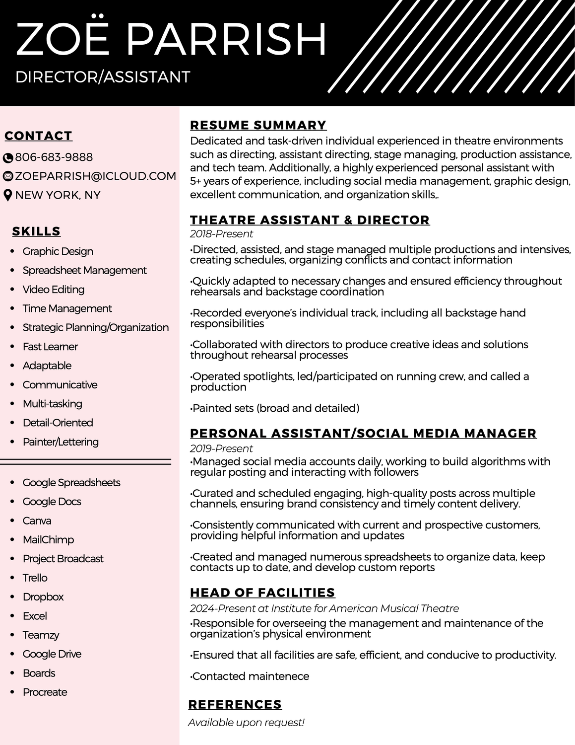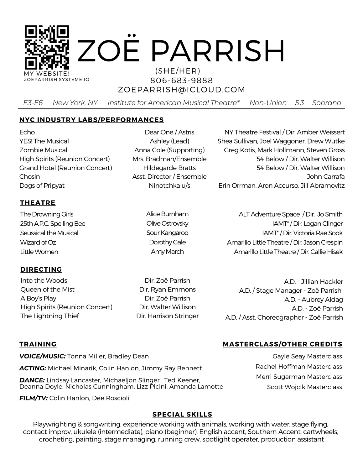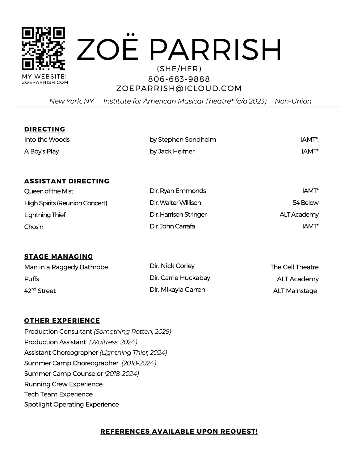 I performed, and worked on crew, in a number of productions throughout my middle school and high school years in Texas until I graduated in 2021. Since then I have moved to New York City, graduated from the Institute for American Musical Theatre (under director Michael Minarik), and performed in a variety of NYC Workshops and productions.